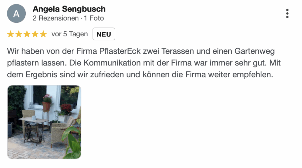 Pizza PlanetTrustindex überprüft, ob die Originalquelle der Bewertung Google ist. Danke für ihre zuverlässige Arbeit. Schnell & sauber. Gute Jungs ihre Mitarbeiter! Markus GrafeTrustindex überprüft, ob die Originalquelle der Bewertung Google ist. Sehr faire Preise, ordentliche und schnelle Arbeit sehr gerne wieder . Sehr zu empfehlen Stephan HansTrustindex überprüft, ob die Originalquelle der Bewertung Google ist. Wir möchten uns noch mal über diesen Weg bei ihnen bedanken . Wir sind sehr zufrieden mit ihrer arbeit und das wir zusammen alles telefonisch und persönlich besprechen konnten. Die kosten für das bauvorhaben ist top,Preis Leistung ist sehr gut . Wir werden sie weiter empfehlen . sylvia petersTrustindex überprüft, ob die Originalquelle der Bewertung Google ist. Wir sind echt zufrieden. Schnelle und ordentliche Pflasterarbeiten. Auch der Preis ist super für solch eine Leistung. Kann ich nur weiter empfehlen 👍 tolles Team.Google Gesamtbewertung 5.0 von 5, basierend auf 5 Bewertungen